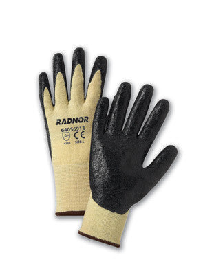 Description: Radnor Nitrile Palm Coated Kevlar/Lycra Gloves use a 13 gauge seamless Kevlar/Lycra shell with a nitrile palm coating that resists abrasions and tears while repelling oil for improved grip